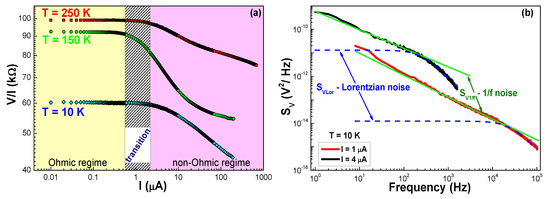 - Belogolovskii, M.; Jung, G.; Markovich, V.; Dolgin, B.; Wu, X.D.; Yuzhelevski, Y. Bias dependent 1/f conductivity fluctuations in low-doped La1−xCaxMnO3 manganite single crystals. J. Appl. Phys. 2011, 109, 73920. [Google Scholar] [CrossRef]