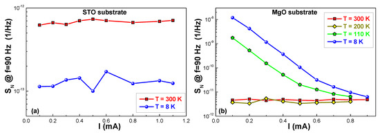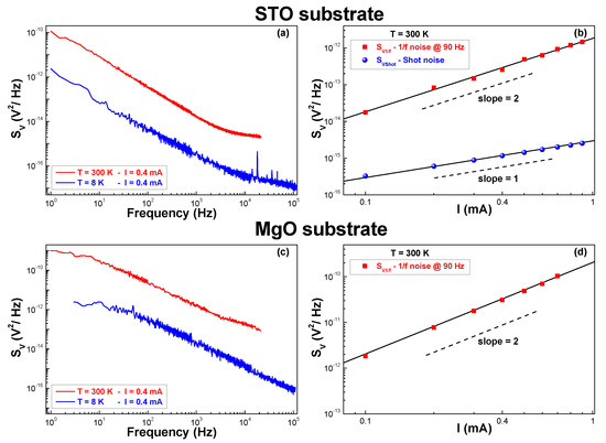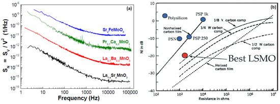- Routoure, J.M.; Méchin, L.; Fadil, D.; Barone, C.; Mercone, S.; Perna, P.; Flament, S. Low frequency noise in La0.7Sr0.3MnO3 thin films: Effects of substrate materials and contact resistance. AIP Conf. Proc. 2007, 922, 229–232. [Google Scholar]