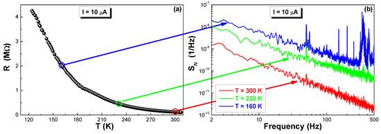 - Bid, A.; Guha, A.; Raychaudhuri, A.K. Low-frequency random telegraphic noise and 1/f noise in the rare-earth manganite Pr0.63Ca0.37MnO3 near the charge-ordering transition. Phys. Rev. B 2003, 67, 174415. [Google Scholar] [CrossRef]
