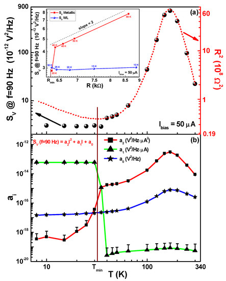 - Barone, C.; Romeo, F.; Galdi, A.; Orgiani, P.; Maritato, L.; Guarino, A.; Nigro, A.; Pagano, S. Universal origin of unconventional 1/f noise in the weak-localization regime. Phys. Rev. B 2013, 87, 245113. [Google Scholar] [CrossRef]
