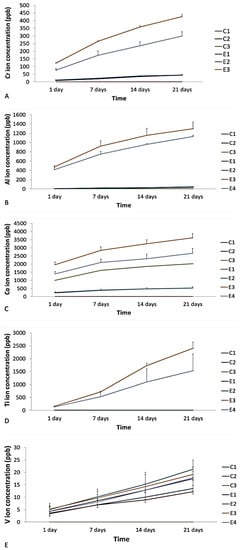 The evolution of ion release over time. (A) chromium; (B) aluminium; (C) cobalt; (D) titanium; and (E) vanadium.