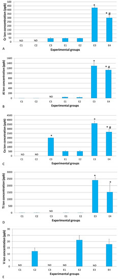 The concentration of ions released at 21 days. (A) chromium; (B) aluminum; (C) cobalt; (D) titanium; and (E) vanadium. “*” in Cr, Al, Co and Ti indicates statistically significant differences to E1; “#” in Al, Cr and Co indicates statistically significant differences to E3; ND: non-detectable.