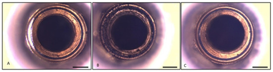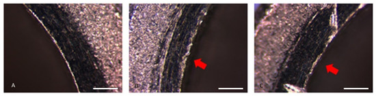 Pictures (×8) of the external implant platform: (A) without superstructures; (B) connected to a Cr–Co crown; and (C) connected to an intermediate abutment. The red arrows show the deformation of the internal part. Scale bar indicates 200 µm.