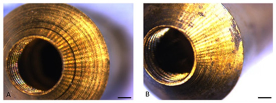 The analysis of the corrosion conducted by observing the stereomicroscopic images showed changes in the surfaces. In the internal part of the implant, material transfer could be observed in the groups where the crown was screwed directly to the implant (E1 and E3), whereas no material transfer between the implant and the abutment was observed in the groups with intermediate abutments (E2 and E4) (Figure 3).