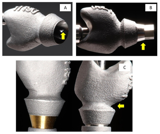 (A) A Cr–Co crown (the yellow arrow indicates the mechanized connection part); (B) A Cr–Co crown with the intermediate anodized abutment; (C) On the left, a Cr–Co crown connected to the anodized abutment and the dental implant. On the right, a Cr–Co crown connected directly to the dental implant with an exposed mechanized surface.
