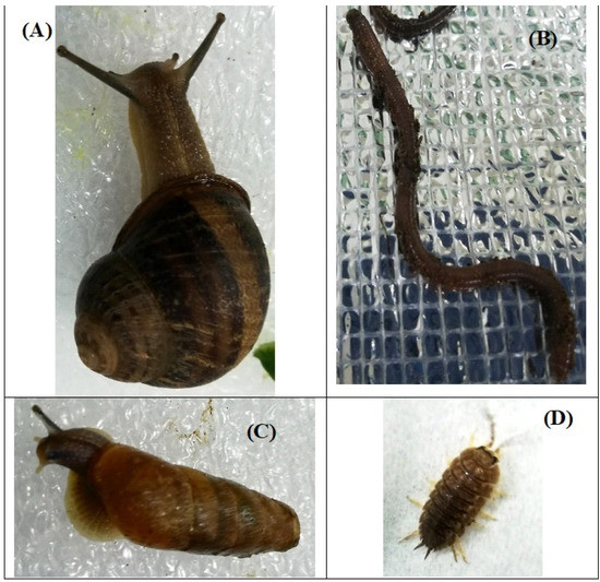 Representative photos of the collected terrestrial samples: (A) E. vermiculata (helix), (B) Lumbricus terrestris (earthworm), (C) R. decollata (decollate), and (D) Porcellio (woodlice).