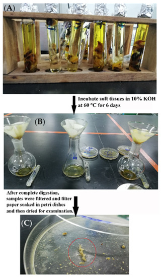 Steps of treatment: (A) soft tissues treatment with 10% KOH and incubation at 60 °C for 6 days; (B) filtration after complete digestion; (C) dryness of filters in Petri dishes for further analyses. Red circle refers to a spiral shape that remained undigested after the whole digestion of R. decollata soft body.