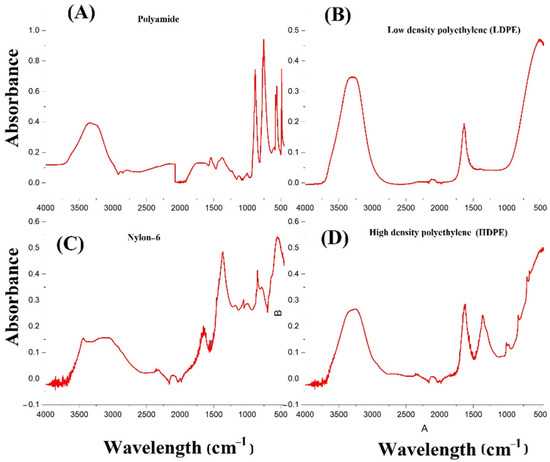 FTIR spectra of polyamide (A), LDPE (B), nylon 6 (C), and HDPE (D) present in samples.