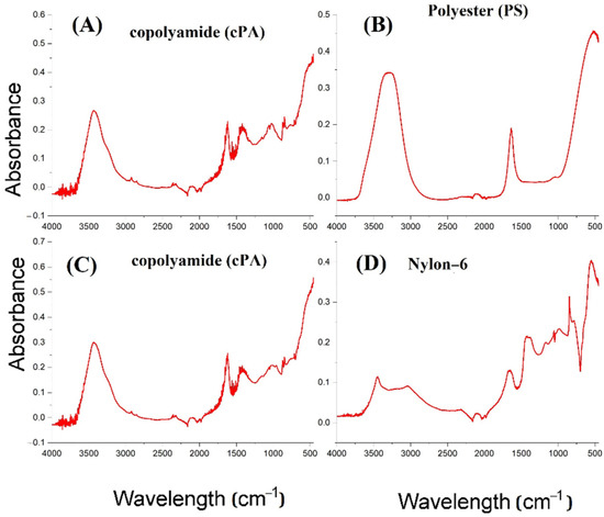 FTIR spectra of cPA (A,C), PS (B), and nylon 6 (D) present in samples.