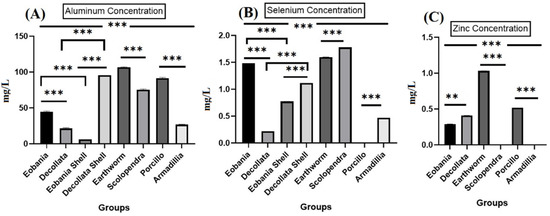 Assessment of aluminum (A), selenium (B), and zinc (C) present in the filtrate of different terrestrial biota in mg/L. *** indicates p ≤ 0.001 and ** indicates p ≤ 0.01 by comparing related samples with each other.