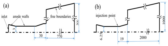 CFD computational domain geometry. (a) F4 plasma torch and (b) O3CP plasma torch. All dimensions are in millimeters.