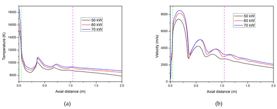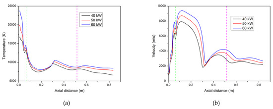 Variation of the temperature (a) and velocity (b) of the plasma jet along the jet axis for different net electric powers. 60 SLPM of argon, 30 SLPM of helium, chamber pressure: 100 Pa. The green vertical dotted line indicates the location of the plasma torch nozzle exit. The purple vertical dotted line indicates the location of the substrate during actual coating deposition.