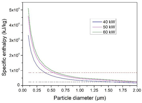 Figure 9 shows the same data as Figure 8 for the specific enthalpy gained by the particles during their flight in the free jet, from the torch exit to the deposition location, 450 mm downstream of the nozzle exit. At this distance, the particles that can be completely vaporized in the free jet are 0.32, 0.38 and 0.41 µm in diameter, for net torch powers of 40, 50 and 60 kW, respectively, while they are 0.40, 0.53 and 0.58 µm inside the plasma torch. This result is easily explained by the decrease in the heat transferred to the particles in the free jet, even if their residence time is much longer than inside the torch. The decrease in the heat transfer to particles is essentially due to the Knudsen effect and decrease of gas temperature and ionized species.