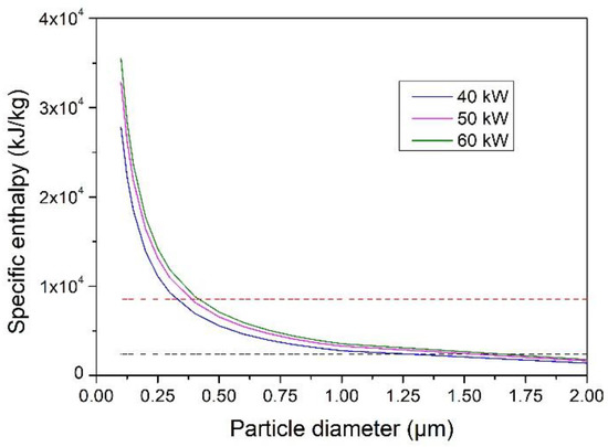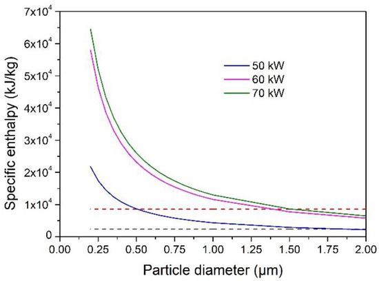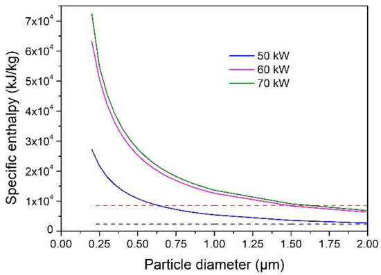 The sizes of the particles that can be fully vaporized inside the torch nozzle are 0.63, 1.48 and 1.60 µm and in the deposition chamber 0.51, 1.35 and 1.52 µm, respectively, for a torch power of 50, 60 and 70 kW (Figure 14). Under the conditions of the study, the enthalpy gained by the particle in the torch nozzle is comparable with that gained in the chamber over a distance of 1 m. Finally, the sizes of the particles that can be fully vaporized in the whole deposition process are 0.72, 1.75 and 1.90 µm, respectively, at 50, 60 and 70 kW. This is consistent with experimental studies that show that under similar PS-PVD conditions, the size of the particles should be less than 2 µm [12,25,37].