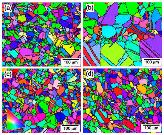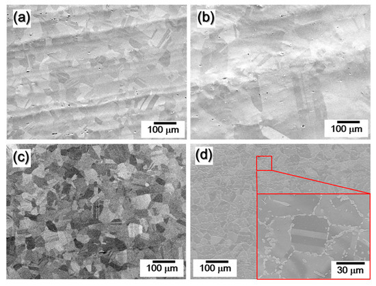 Figure 2a,b, it is evident that the grains grew obviously after heat treatment. The grains in sample #1 were homogeneous and had twin structures, and the grain size of sample #2 was around 100 μm. However, as shown in