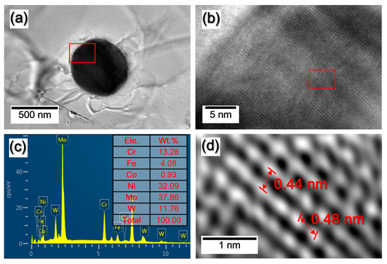 Figure 6a presents a closer observation of one particle as revealed by TEM. In the high magnification image (b), the chemical composition (c) and atomic arrangement spacing of the precipitated phase are proved (d). Based on the results, the precipitates were not only Mo carbides, but also W carbides. The distances between their atoms were, respectively, 0.44 and 0.48 nm.