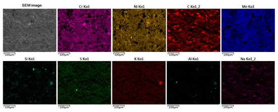 Figure 9). Particle enrichment was obvious in specimen #3, and EDS surface scanning proved that the enrichment was mainly of Cr and C, as well as some granular impurities (see