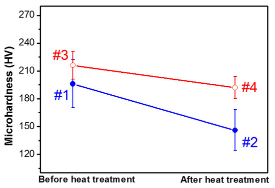 Figure 11 is the result of microhardness measurement. The microhardness test was performed with a load of 200 g and a loading time of 10 s, taken from matrix of each specimen. all tested specimens were metallographically polished and 5–8 points were selected to calculate the average value. It reveals that the hardness changed greatly from specimen #1 to specimen #2, and that the material properties decreased obviously. In contrast, from specimen #3 to specimen #4, the hardness remained relatively stable.