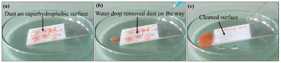 - Geyer, F.; D’Acunzi, M.; Sharifi-Aghili, A.; Saal, A.; Gao, N.; Kaltbeitzel, A.; Sloot, T.-F.; Berger, R.; Butt, H.-J.; Vollmer, D. When and how self-cleaning of superhydrophobic surfaces works. Sci. Adv. 2020, 6, eaaw9727. [Google Scholar] [CrossRef] [PubMed]