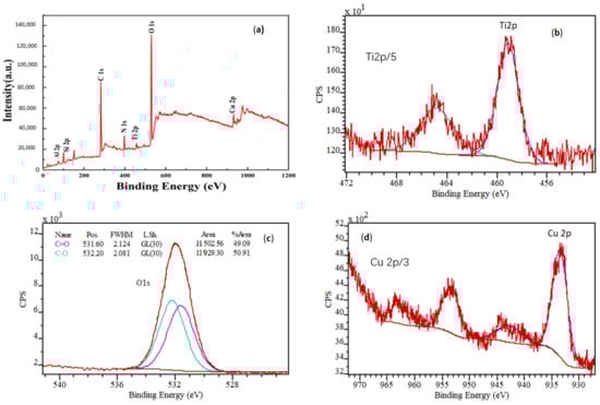 X-ray photoelectron spectroscopy (XPS) spectra and high-resolution XPS spectra of MAO coating with Cu: (a) survey; (b) Ti 2p; (c) O 1s; (d) Cu 2p.