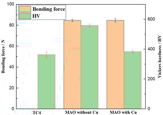 The bonding strength between the MAO coating and substrate affects its performance to a great extent, and obtaining high hardness is an effective way to improve the wear resistance of the coating. The bonding force and hardness values of TC4, MAO without Cu, and MAO coating with Cu are shown in Figure 3 The bonding force of MAO coating without Cu and MAO coating with Cu was 84.58 and 84.65 N, respectively. This high bonding strength of the high coating substrate has exceeded the bonding strength of the hard film on tool, which is due to the metallurgical bonding between coating and substrate []. The microhardness values of TC4, MAO coating without Cu, and MAO coating with Cu were separately 363 HV, 558 HV and 384 HV, respectively. Obviously, the microhardness of the coating decreased after the addition of copper pyrophosphate due to a low hardness value of copper oxide.