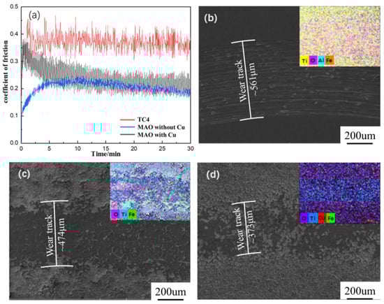 The friction curves of TC4 and two MAO coatings is shown in Figure 4a. The friction coefficient of the TC4 substrate was high and fluctuated greatly. Compared with the substrate, the friction coefficient of the MAO coating without Cu changed low, but its fluctuations are still evident. The friction coefficient of the MAO coating with Cu was smooth and the fluctuation is very small in the simulated seawater, showing excellent tribological behavior, which was due to the self-lubrication of Cu in the MAO coating. Figure 4b illustrates the wear track (about 561 μm) of the TC4 alloy, showing furrow wear property. Fe element from the grinding ball appeared in the wear track, and the distribution of O at the wear track was obvious, indicating the oxidation phenomenon occurred during the wear process in the simulated seawater. As shown in Figure 4c,d, the wear tracks of the two MAO coatings were 474 μm and 373 μm, respectively. It could be found that smooth and continuous oxide glaze layers were formed, which is characteristic of adhesive wear. For the MAO coating with Cu in particular, the existence of Cu had a self-lubricating effect and improved the tribological property in simulated seawater.