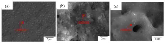 Figure 1 shows surface morphologies of TC4 and the MAO coatings prepared in various solutions. As shown in Figure 1a, the surface of TC4 without MAO coating is smooth and flat. It mainly contains Ti, Al and V elements, and each element is evenly distributed. As shown in Figure 1b, the MAO coating without Cu has many crater-shaped discharge channels, showing some volcanic bulges. The roughness of this coating is 1.95 µm. The average aperture and area is 0.66 and 0.76 µm2, respectively. This coating is mainly composed of Ti, Si and O elements, and Ti comes from the TC4 substrate, O and Si from the electrolyte. Solute ions are strongly involved in the formation of MAO coating, which is consistent with the literature []. It can be obtained by Image Pro Plus software that the average aperture and area of MAO coating with Cu is 0.91 µm and 1.08 µm2, respectively, and the roughness of this film is 2.19 µm, shown in Figure 1c. The higher surface roughness may be related to the more intense micro arc discharge process caused by the addition of copper pyrophosphate. The EDS results of the coating are shown in Figure 1d. It is found that Cu element is concentrated around the pore. Wang et al. obtained similar research results []. It is known that the growth of MAO coating is a cyclic process of breakdown and condensation [,,]. Due to a low melting point of Cu, it is preferentially attached to the coating by the strong discharge. As a result, the enrichment of copper in turn led to poor insulation in this region and preferential breakdown discharge.