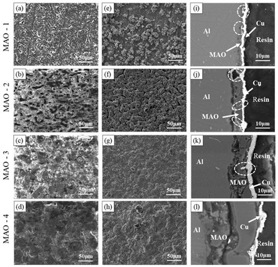 Surface morphology of MAO coating (a–d), surface morphology of MAO + Cu composite coating (e–h) and cross-section morphology of MAO + Cu composite coating (i–l). three-dimensional pictures are provided as Supplementary Figure S1.