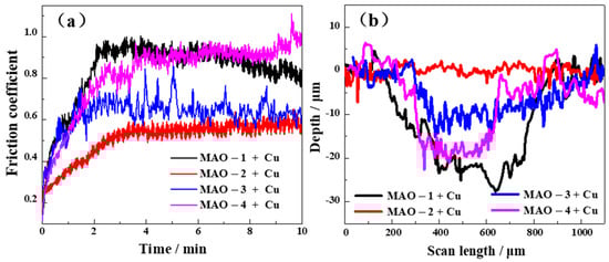 The change in friction coefficient with respect to time is shown in Figure 4a. The friction coefficient of the 6061 aluminum alloy matrix is about 0.7 []. The friction coefficient of Cu is about 0.6 []. The results of the friction coefficient test found that the MAO-2 + Cu composite coating with the highest copper plating rate and the best bonding force has the smallest average friction coefficient (0.5) and a small fluctuation range. Figure 4b shows the two-dimensional profile of the surface wear marks of different MAO + Cu composite coatings. The addition of the MAO + Cu composite coating can greatly reduce the wear depth and wear width of the aluminum alloy and the addition of the copper plating layer has a lubricating effect and further reduces the depth of the wear marks. After the wear test, SEM and EDS describe the surface morphology of the wear scar and the composition of the coating for revealing the wear mechanism of the composite coatings.