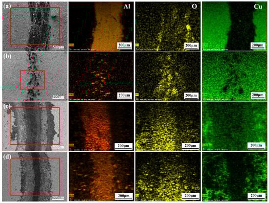 Surface morphologies and EDS results of composite coatings after friction tests: (a) MAO-1 + Cu; (b) MAO-2 + Cu; (c) MAO-3 + Cu; (d) MAO-4 + Cu.