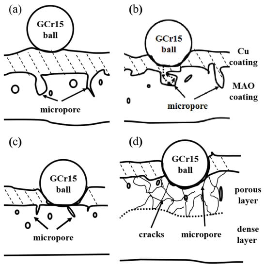 The MAO + Cu composite coatings wear progressed in three stages as schematically modeled in Figure 6. In the first stage in (Figure 6b), the copper layer is worn first, and the copper has good deformability, and part of the copper will be squeezed into the interior of the MAO ceramic surface of the microporous coating. In the next stage, which occurred after complete removal of the Cu layer, the high-hardness MAO ceramic coating can still play a certain protective role (Figure 6c). In the third stage, there is a period of time when the porous coating in the ceramic is relatively large and dominates after the outer oxide layer is completely removed. The compressive stress generated under the contact surface has caused the propagation of perpendicular and parallel cracks. The ceramic particles formed wear debris, and the wear amount was increased (Figure 6d).