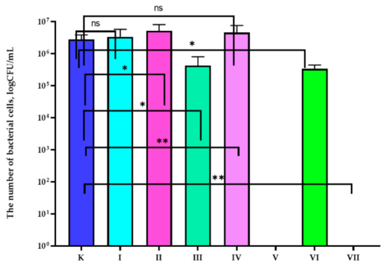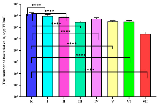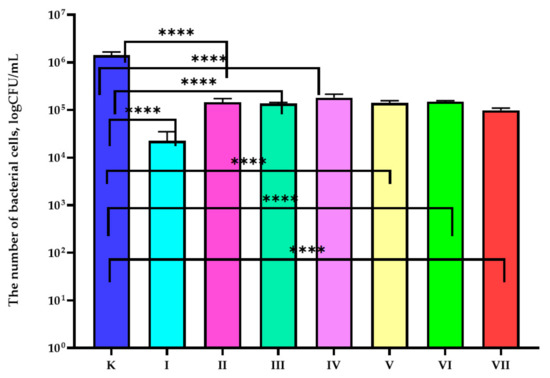 The results of the study showed that all of the active layers containing pure CO2 extracts and their mixtures as active substances did not inhibit the growth of B. subtilis, but decreased the number of microorganism cells. As demonstrated below (Figure 4), the statistically significant antibacterial activity of coatings II–VI and VII was noted. In the case of these coatings, a small (1 log) reduction in the amount of B. subtilis was noticed. The results confirmed that the coating containing CO2 raspberry seed extract as an active substance caused a 2 log reduction in the number of viable microorganism cells. A statistical analysis (Figure 4) determined that the differences between numbers of B. subtilis viable cells incubated with the active coatings were significant compared to the PE foil samples devoid of coatings (K). Summarising, it can be said that coatings II–VII showed low, and coating I showed moderate activity against B. subtilis, resulting from the 1 log-2 log reduction in the number B. subtilis, devoid of a complete inhibition in the growth of the microorganism.