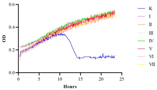 The results of the work illustrate (Figure 5) that the incubation of the phi6 bacteriophages with the I–VII active layers completely inactivated the bacteriophage particles. An evaluation of the OD over time of the P. syringae strain cultivated with the phi6 particles (after the incubation of the phi6 particles with PE foil samples coated with the active layers, respectively: I–VII separately) was carried out and an OD fall was not noted after 24 h of phage cultivation with the host culture (Figure 5), which showed that phi6 bacteriophage did not eliminate any of the bacterial cells. These results proved that the phages were not active after their incubation with all of the active coatings. The antiviral properties of all of the described coatings were confirmed using a modified ISO 22196-2011 standard. As emphasized in Figure 6 and Table 2, the number of the phi6 particles after their incubation with each film coated with the active layer was found to be zero, meaning that phages did not reduce the number of host cells. To summarise, it can be assumed that all of the analysed coatings showed very high antiviral activity.