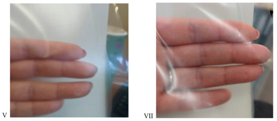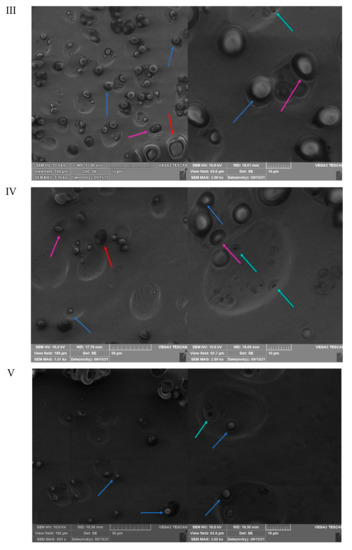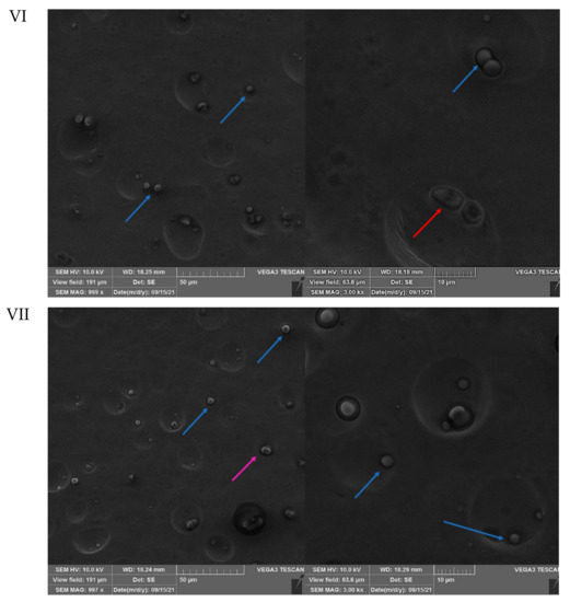 All of the coatings that were obtained were smooth and transparent. The addition of a mixture of emulsifiers made this possible. Figure 7 shows pictures of coatings V and VII, which were highly active against the largest number of tested bacterial strains and phi6 phage particles. On the other hand, a SEM analysis demonstrated that the coatings were not homogeneous. As shown in Figure 8 (SEM images in magnification of 1000× and 3000×) and in Supplementary Materials (SEM images in higher magnification), the hydrophobic molecules of the active substances were visible in the hydrophilic carrier. The molecules were spherical (marked with a blue arrow) and elliptical in shape (marked with a pink arrow). The molecules which were irregular in shape (marked with a red arrow) were also observed. The particle distribution was also irregular. As shown in Figure 8, holes (marked with green arrows) in the coatings were also observed, which confirmed that extract particles had been released from the coating. The release of active compounds from the coatings may lead to a decrease in the activity of the coatings. Comparing coatings I–VII led to the observation that the coatings that consisted of coating carrier with mixtures of CO2 extracts of raspberry seeds, pomegranate seeds and rosemary contained more spherical molecules than coatings with the addition of one extract. Moreover, the active particles of the active substances from coatings IV–VII were of smaller size to the antimicrobial molecules of coatings I–III.