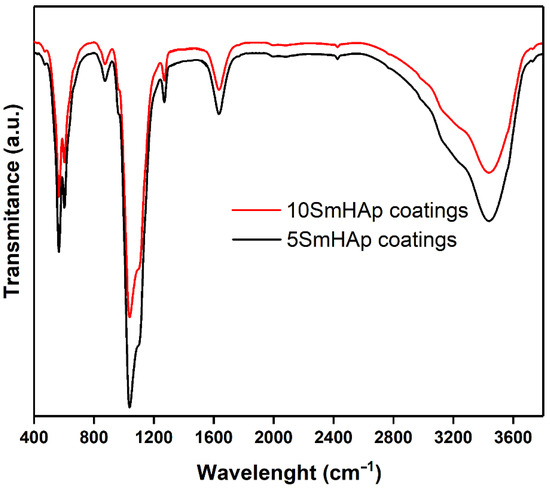 The functional groups presented in the obtained 5SmHAp and 10SmHAp coatings were investigated by FTIR measurements. The results of the FTIR studies are presented in Figure 2. Thus, both in the case of 5SmHAp and in the case of 10SmHAp coatings could be noticed the presence of main vibrational bands characteristic of the PO43− and OH− groups from the hydroxyapatite (HAp) structure. Also, could be noticed the presence of the vibrational bands specifics to adsorbed water. The main vibrational bands presented in the 1600–1700 cm−1 and 3200–3600 cm−1 spectral regions are attributed to O–H bending mode of lattice water [22]. The vibrational band at around 962 cm−1 is also specific to phosphate group (ν1). The main vibrational bands presented at about 1043 and 1091 cm−1. are specific to phosphate group (ν3) [25]. Also, the vibrational bands at around 602 and 566 cm−1 are characteristic to ν4 vibration mode of PO43− group from the hydroxyapatite structure. Previous studies [28] have shown that the vibrational bands specific to hydroxyl groups from HAp structure presented at around 632 cm−1 and 3568 cm−1 could indicate a well crystalized HAp structure. Also, in the Figure 2 it can be seen that the intensity of the vibration bands is decreasing with the increase of the samarium concentration in the samples. Similar behavior has been reported by D. Predoi et al. in their previous studies conducted on zinc doped hydroxyapatite [29]. Also, in the case of 10SmHAp coatings a slight displacement of the position of the vibrational bands was noticed.