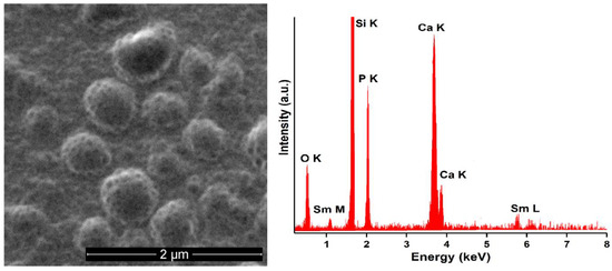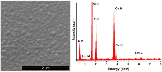 Scanning electron microscopy (SEM) was used in order to analyze the surface morphology of 5SmHAp and 10SmHAp coatings. Therefore, a HITACHI S4500 microscope (Hitachi, Ltd., Tokyo, Japan) equipped with energy-dispersive X-ray spectroscopy (EDX) (Ametek EDAX Inc., Mahwah, NJ, USA) attachment operating at 20 kV was used for coatings investigation.
