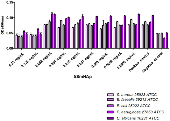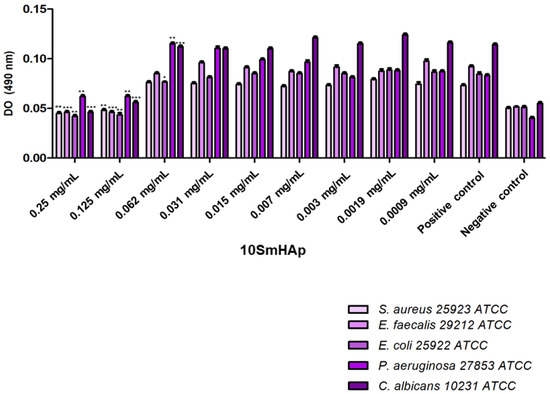 The 5SmHAp and 10SmHAp were investigated for their in vitro antibacterial activity against two Gram negative (Escherichia coli 25922 ATCC, Pseudomonas aeruginosa 27853 ATCC) and two Gram positive (Staphylococcus aureus 25923 ATCC, Enterococcus faecalis 29212 ATCC) and for in vitro antifungal activity against Candida albicans ATCC 10231. The evaluation of the biological activity of the compounds was performed by broth microdilution method. The microbial suspensions were prepared in sterile PBS (phosphate buffer saline) by suspending four to five colonies from 18–24 h pure cultures grown on solid media. The bacterial suspensions adjusted to the McFarland standard 0.5 were further diluted to 1:100 in Muller Hinton broth (MHB). Ten binary dilutions starting from 10 mg/mL (compound stock solution in DMSO) for each of tested compound and DMSO, were prepared in sterile MHB dispensed in 96-well sterile microplates. Each well of the microplates containing the SmHAp solution was inoculated with the microbial suspensions. For each tested compound, a sterility control that contained only broth and a growth control containing broth and microbial inoculum was prepared. The microplates were incubated at 37 °C for 16–24 h. The MICs values defined as the lowest concentrations of the compound that inhibited the microbial growth of the tested microbial strains were determined based on the absorbance values assessed spectrophotometrically at 620 nm. The assay was performed in duplicate.