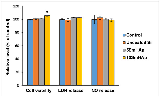 Biocompatibility of uncoated Si substrates and different samarium doped hydroxyapatite coatings as shown by cell viability, lactate dehydrogenase (LDH), and nitric oxide (NO) release assays after 24 h exposure on normal gingival fibroblasts. Results are expressed as the mean ± standard deviation (SD) (n = 3) and represented relative to the untreated cells (control). * p < 0.05 compared to control.