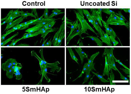 Actin cytoskeleton organization of gingival fibroblast cells after 24 h of incubation with uncoated Si substrates and different samarium doped hydroxyapatite coatings. F-actin (green) was labeled with phalloidin-phalloidin-fluorescein isothiocyanate (FITC) and nuclei (blue) were counterstained with 4′,6-diamidino-2-phenylindole dihydrochloride (DAPI). Scale bar: 20 µm.