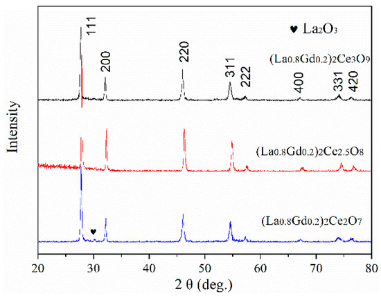 Figure 1 shows the XRD patterns of the coatings prepared by spraying different lanthanum-cerium-oxide powders. It can be observed that the coatings were mainly composed of fluorite phase. There was a small amount of La2O3 in the coating obtained by spraying (La0.8Gd0.2)2Ce2O7 powder. It was reported that the lower vapor pressure of La2O3 results in extra being left during plasma spraying when compared with that of CeO2. The lattice parameters of the coatings were calculated according to XRD patterns peaks, which were 0.5561 nm, 0.5541 nm, and 0.5577 nm when (La0.8Gd0.2)2Ce2O7, (La0.8Gd0.2)2Ce2.5O8, and (La0.8Gd0.2)2Ce3O9 were used as a spray powder, respectively.
