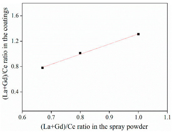 The relationship of the (La + Gd)/Ce ratio between the spray powders and coatings.