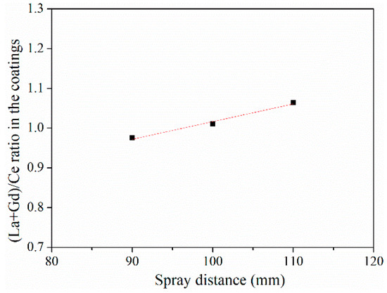 The (La + Gd)/Ce ratio in the as-sprayed coatings as a function of the spray distance is shown in Figure 4. The (La + Gd)/Ce ratio increased with the increase of the spray distance from 90 to 110 mm, which was 0.97, 1.01, and 1.06, respectively. It can be inferred that the evaporation degree of Ce intensified with the increase of spray distance during the plasma spraying process, probably caused by the increasing heat time and melting degree of the spray powders. The ratio was close to 1 at the spray distances of 100 mm. Therefore, considering the influence of spray distance on the coating microstructure and composition, the spray distance of 100 mm was selected.
