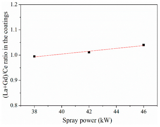 (La + Gd)/Ce ratio in the as-sprayed coatings versus spray power.