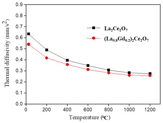 The thermal conductivities were calculated using Equation (1), as shown in Figure 9. The error bars were omitted for the same the reason. The LGC coating exhibited lower thermal conductivities than that of the LC coating, which was ~0.67 W/m·K at 1200 °C. It is well known that the thermal conductivity is proportional to the mean free path of phonon, according to the phonon thermal conduction theory [35]. In the LGC ceramics, Gd3+ take the site of La3+ in LC ceramics. The substitutional atoms existing in the lattice of LC can also reduce the mean free path of phonon, therefore leading to the decrease in thermal conductivity [24].