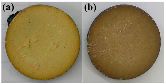 The macro-image of the failed coatings after thermal shock test: (a) LC/YSZ after 68 thermal cycles, and (b) LGC/YSZ after 109 thermal cycles.