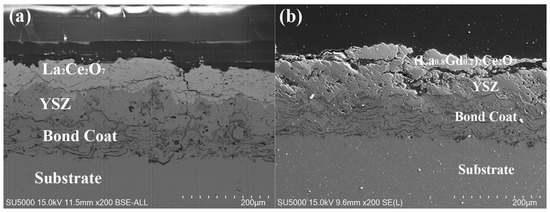 Cross-section morphologies of the failed thermal barrier coatings: (a) LC/YSZ, and (b) LGC/YSZ.