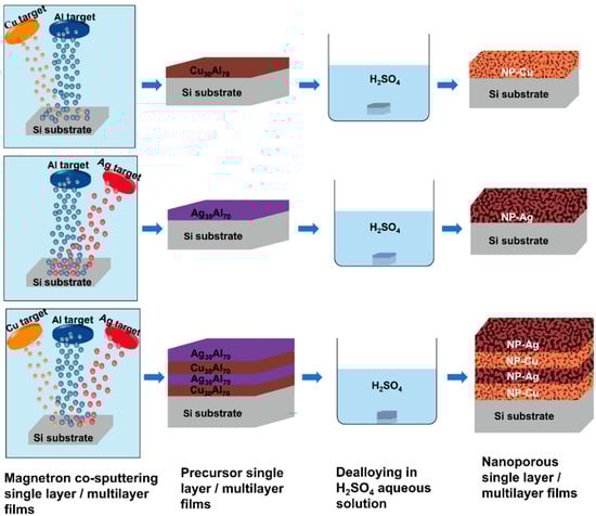 In this study, the precursor films of Ag-Al and Cu-Al were prepared by magnetron co-sputtering. NP-Ag and NP-Cu films were prepared by dealloying in the H2SO4 solution, respectively. On this basis, Ag-Al/Cu-Al bilayers and multilayer precursor films were successfully prepared, and NP-Cu/Ag bilayers and multilayer films were obtained by dealloying.