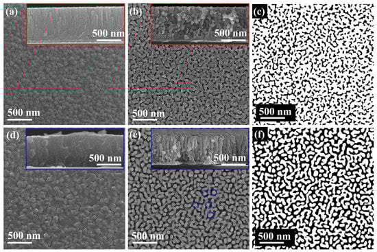 Figure 2a,d shows the plan-view SEM images of as-deposited Cu30Al70 and Ag30Al70 precursor thin films. Their cross-sectional SEM images are shown in the insets in Figure 2a,d, respectively. Figure 2a,d shows that the surfaces of the two films are flat without holes and cracks. The structure of Cu30Al70 film (Figure 2a) grows into columnar grains with a high aspect ratio, and the in-plane grains are relatively smooth polygons. This is because Cu and Al co-sputtering reduces atomic mobility, and the anisotropy of nucleation energy and growth rate leads to film coalescence and thickening []. The statistical grain size is 59 ± 14 nm.