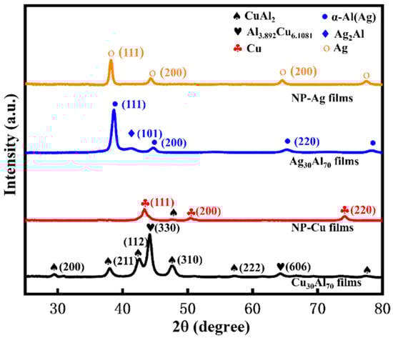 XRD results of the as-deposited Cu30Al70 and Ag30Al70 precursor films and as-dealloyed NP-Cu and NP-Ag films, respectively. The XRD patterns are identified by the database: Cu (PDF#00-004-0836), Al3.892Cu6.1081 (PDF#00-019-0010), Al2Cu (PDF#00-002-1309), Ag2Al (PDF#00-014-0647) and Ag (PDF#00-004-0783).