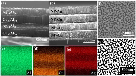 Cross-sectional SEM images of (a) the Cu/Ag precursor multilayer films and (b) as-dealloyed NP-Cu/Ag multilayer films. EDS element distribution image of Cu/Ag precursor multilayer films: (c) Al, (d) Cu and (e) Ag. (f) Plan-view SEM image of NP-Cu/Ag multilayer films. (g) The bright and dark segmentation mask images generated from (f) by AQUAMI software.